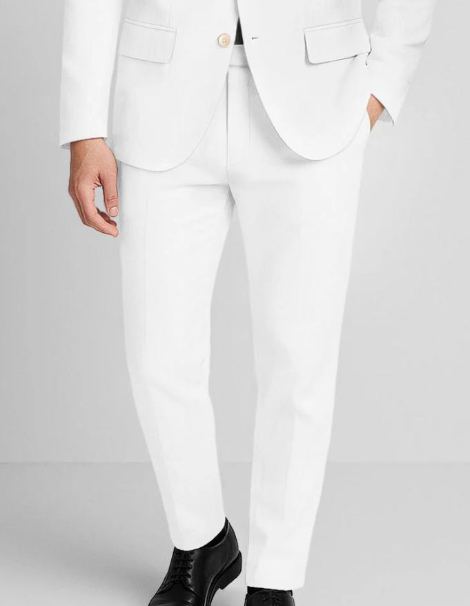 These Tailored White Cotton Suit Pants offer a clean, refined look with a fresh modern edge. The tailored fit delivers a sharp, streamlined silhouette, enhancing a polished appearance without feeling restrictive. The crisp white color creates a sophisticated and versatile foundation, perfect for summer suits, resort wear, and elevated smart-casual styling.